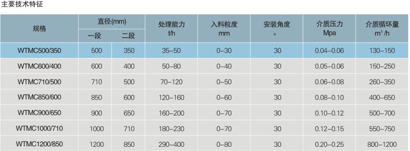 原理:三产品重介质旋流器是由一台圆筒型旋流器与一台筒锥结合型旋流器串联而成。筒型旋流器呈10度~30度倾斜放置,在上部与筒锥型旋流器相串接。分选是从低密度进行,低密度的煤由第一段筒型旋流器的下部溢流管排出,中间产品由上部排出,沿切线方向进入第二段筒一锥型旋流器,在该处获得最终中煤和矸石。从三产品旋流器的第一段不仅可以得到质量高的精煤和稀的重介质,从而可有效地提高第二段的分选密度。